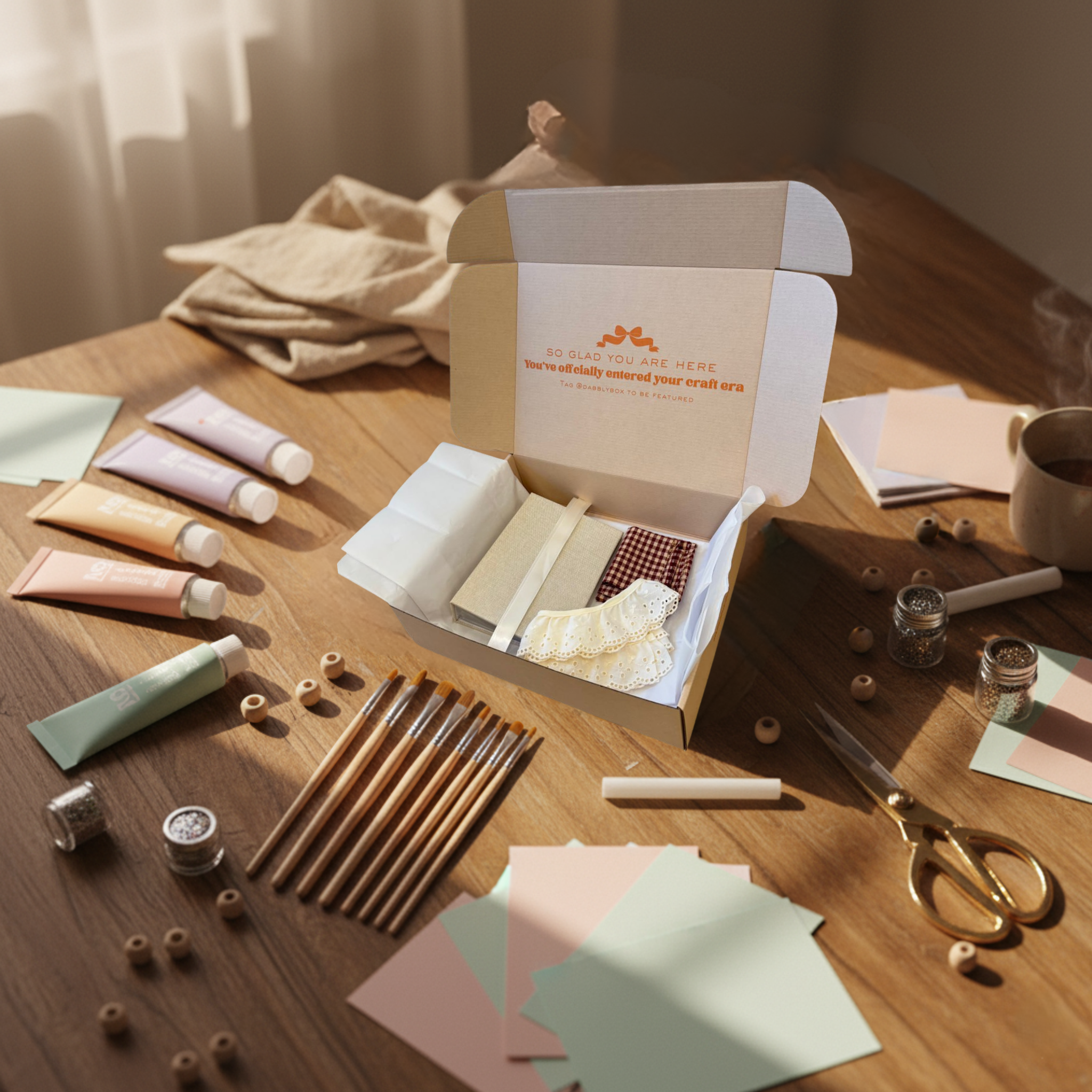 Each Dabbly Box is thoughtfully curated to provide a complete crafting experience. From paints, brushes, and glue to scissors, paper, and other project-specific supplies, everything you need is included — no extra shopping required. Every item is chosen to spark creativity, inspire fun, and make crafting stress-free, so you can focus on enjoying the process and expressing yourself